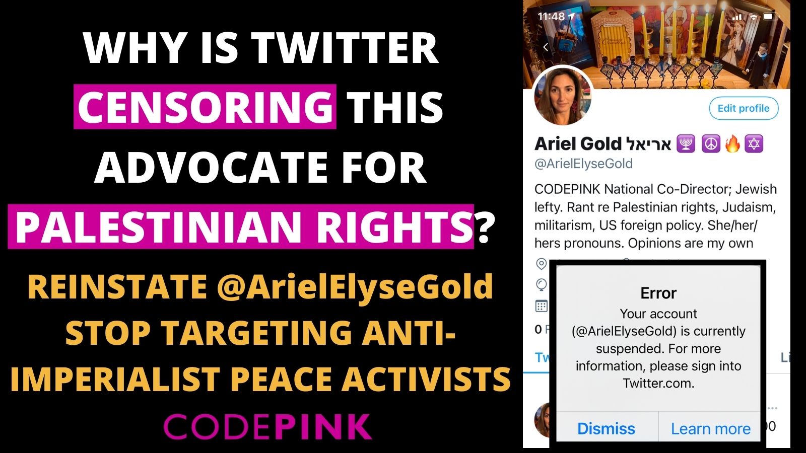 Join CODEPINK’s letter to Twitter telling them to reinstate @ArielElyseGold and to stop targeting Palestinian rights activists and all those who work to end war. Engaging in peaceful political dissent should not be a crime.