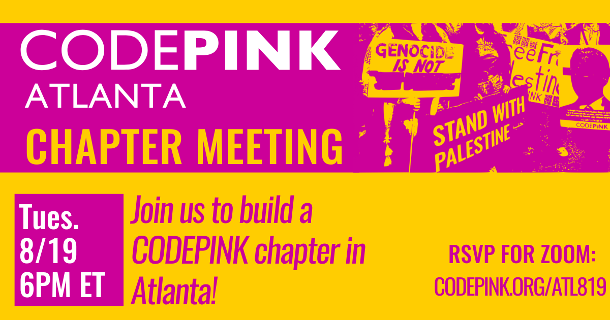 Have you been looking for a community of fellow peacemakers in Atlanta? Would you like to educate your community and plan actions that promote peace, anti-imperialism, and an end to endless war? Join CODEPINK ATL for a virtual chapter meeting as we build our presence in the city! Please RSVP for zoom link!
