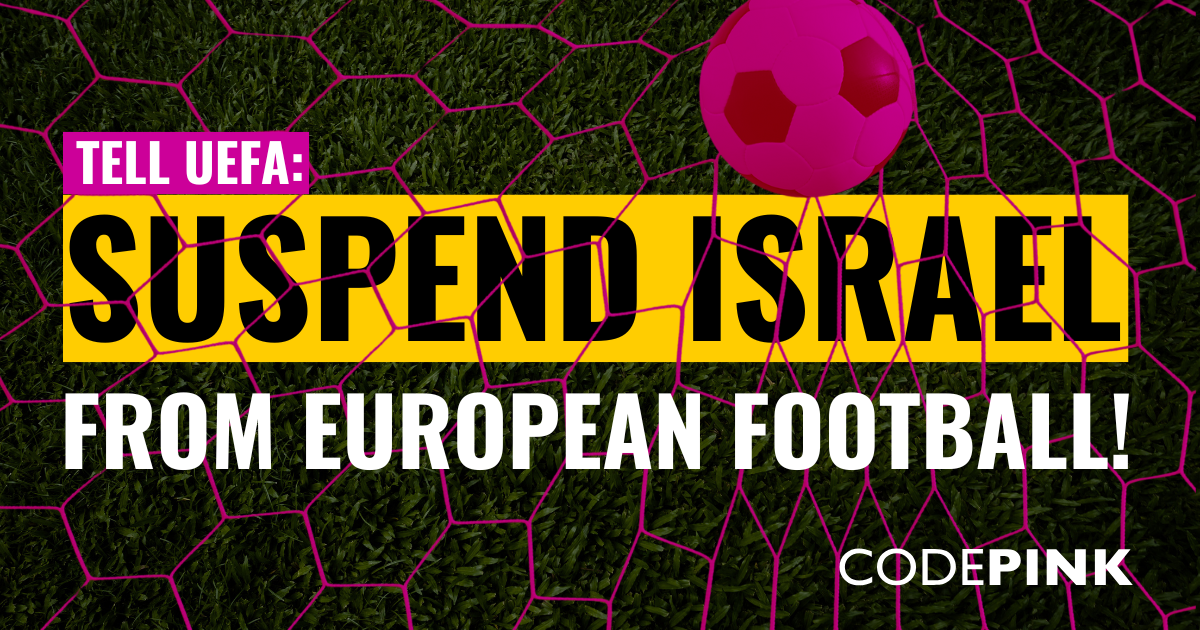 CODEPINK, in collaboration with #GameOverIsrael, has sent two personal appeals to Aleksander Čeferin, the president of the Union of European Football Associations (UEFA), and to his wife, Barbara Čeferin, urging them to take the necessary steps to suspend Israel from European football. Israel being boycotted from the world's most-watched sport would be a monumental stride in the Palestinian solidarity movement, and a huge show of accountability for the genocide it is committing in Gaza.