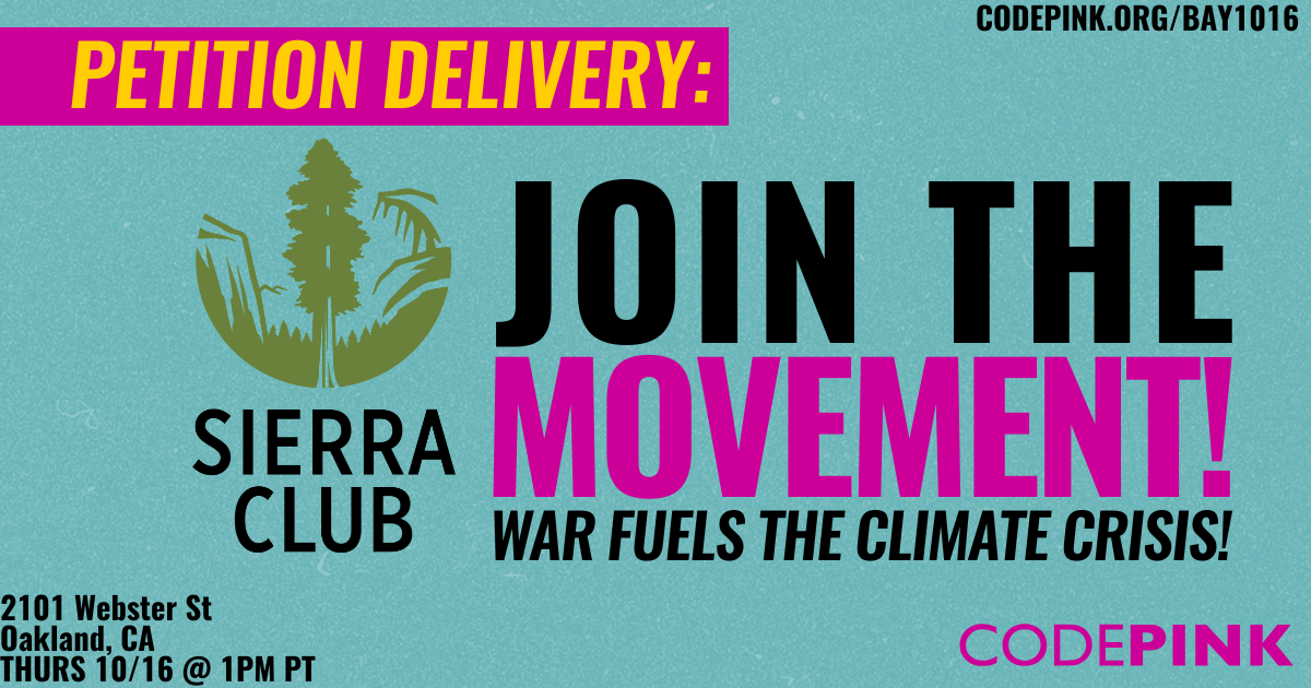 Join Jodie Evans and Cynthia Pappermaster to deliver a petition to the Sierra Club as part of the Elephant in the Room Campaign of the War Is Not Green Campaign!