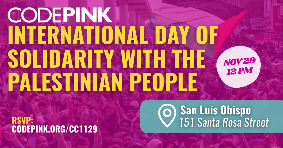 SAN LUIS OBISPO, Calif. —CODEPINK Central Coast plans to hold a vigil on Nov. 29 at 12 p.m. at 151 Santa Rosa St. in San Luis Obispo, marking the International Day of Solidarity with the Palestinian People.