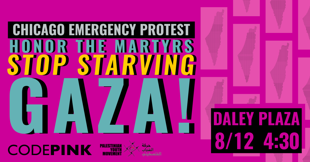Join CODEPINK Chicago along with PYM, USPCN and other organizations on Tuesday, August 12th at 4:30pm at Daley Plaza for an emergency protest and memorial! Bring pots, pans, flowers and letters to honor Palestinian martyrs and protest the ongoing genocide.