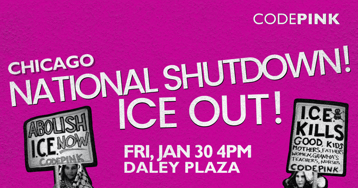 CHICAGO — CODEPINK Chicago joins 40+ organizations and leaders for a nationwide shutdown protest on Friday, Jan. 30, at 4 p.m. at Daley Plaza, demanding the immediate abolition of ICE. The demonstration follows a recent general strike in Minnesota that drew over 100,000 participants.