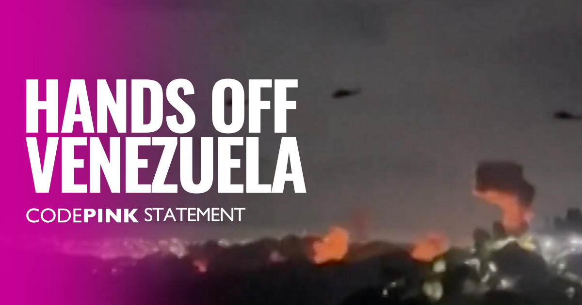 "These are blatant and illegal acts of war by the Trump Administration." CODEPINK Statement on the Bombing of Venezuela and the Kidnapping of Venezuelan President Nicolas Maduro.
