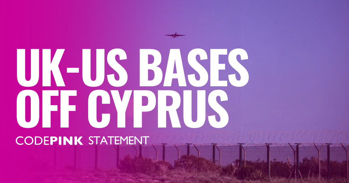 UK-US: Bases Off Cyprus is a coalition of groups across the UK, Cyprus, and the US taking action against the colonial Royal Air Force (RAF) bases occupying the island. The UK currently occupies 3% of Cyprus with these military bases, which have been used to commit genocide in Gaza and bomb Lebanon, Yemen, Afghanistan, and Iraq. Cyprus must no longer be a military outpost for imperialist powers to inflict violence on the world. The coalition demands that the RAF bases be immediately closed and the land returned back to the Cypriot people. For more information about CODEPINK's Bases off Cyprus campaign, please contact Nuvpreet at [email protected].
