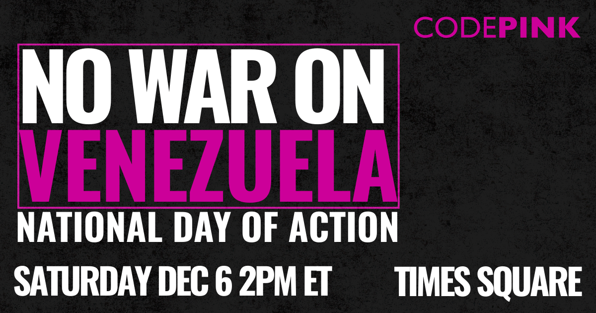NEW YORK – CODEPINK NYC and allied organizations will hold a 'No War on Venezuela – Stop the War Before it Starts' rally on Saturday, Dec. 6, at 2:00 p.m. in Times Square to protest the escalating U.S. military actions toward Venezuela.