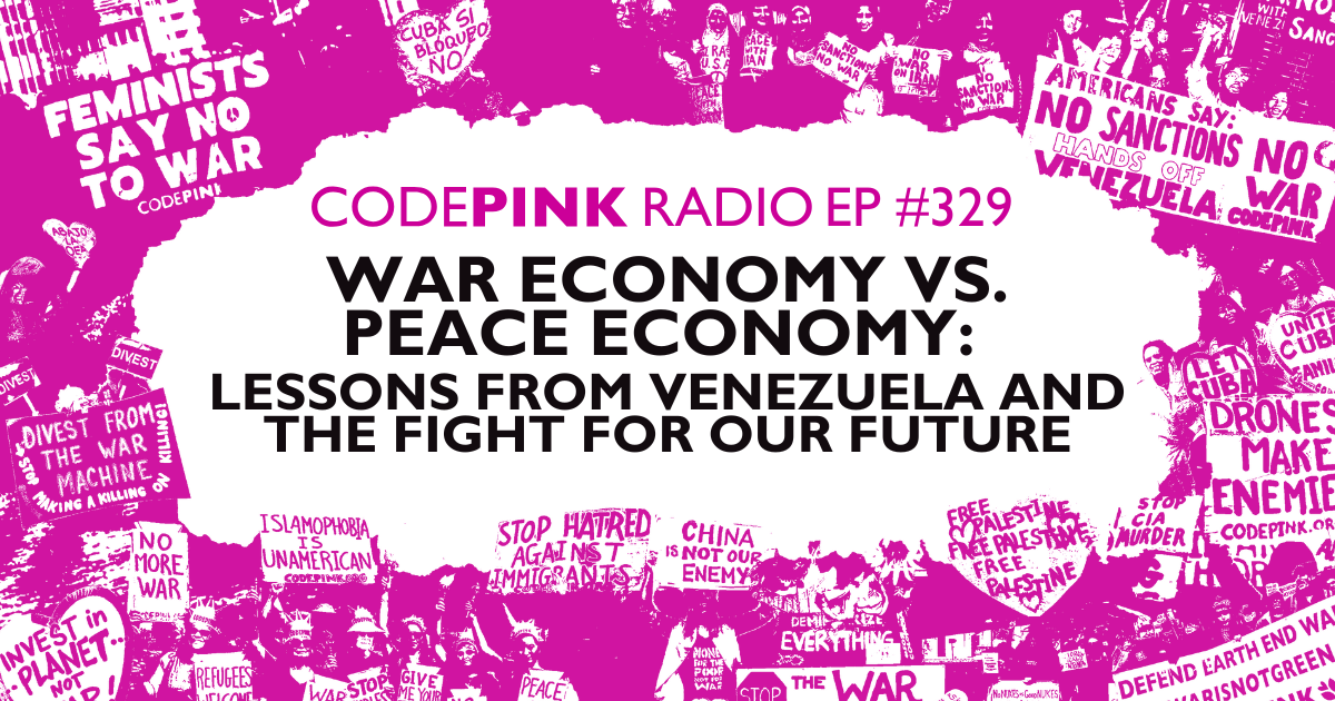 Episode 329: War Economy vs. Peace Economy: Lessons from Venezuela and the Fight for Our Future: In this episode of CODEPINK Radio, CODEPINK co-founder Jodie Evans breaks down how the U.S. war economy shapes our politics, our culture, and our daily lives while offering a clear path toward building a peace economy rooted in care and community. Later on the show, Michelle Ellner connects these ideas to Venezuela, where communes and social programs have helped restore dignity to people long made invisible. As Washington pushes the region toward another conflict, despite 70% of Americans opposing a war with Venezuela, we explore what it means to resist the war economy and strengthen the movements creating a future based on sovereignty, connection, and collective well-being.