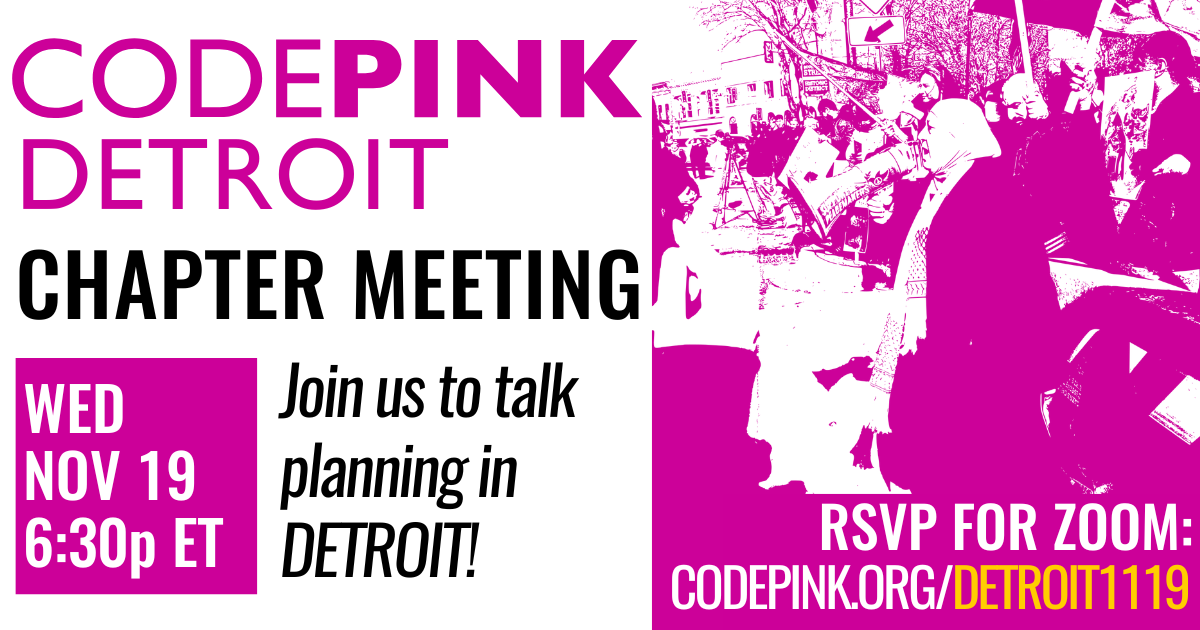 Join CODEPINK Detroit for our next chapter meeting on Wednesday, November 19th at 6:30pm ETย on Zoom!ย