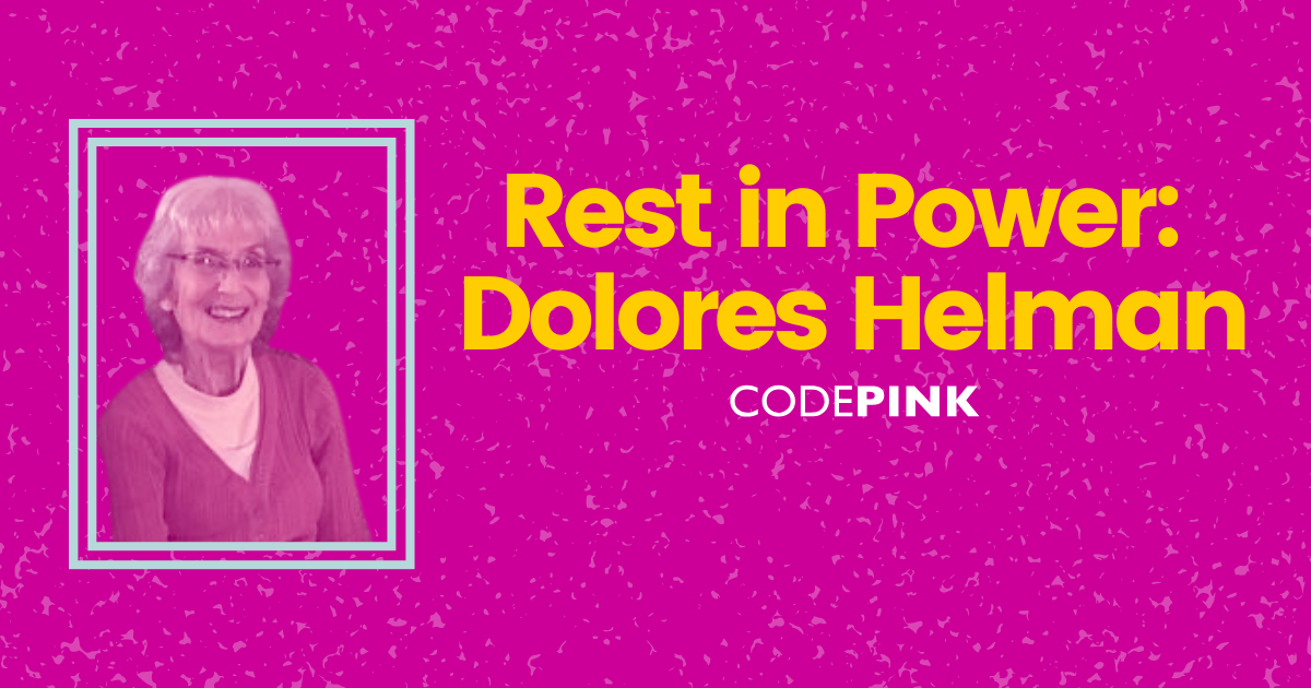 CODEPINK sister Dolores Helman, age 94, “tap-danced her way through the pearly gates with a smile on her face,” according to her life partner Gene Herman, on February 25, 2021. She was a terrific activist dedicated to peace and justice, with such a lively spirit. Delores taught and loved to dance, and she loved to wear pink. We will miss her.