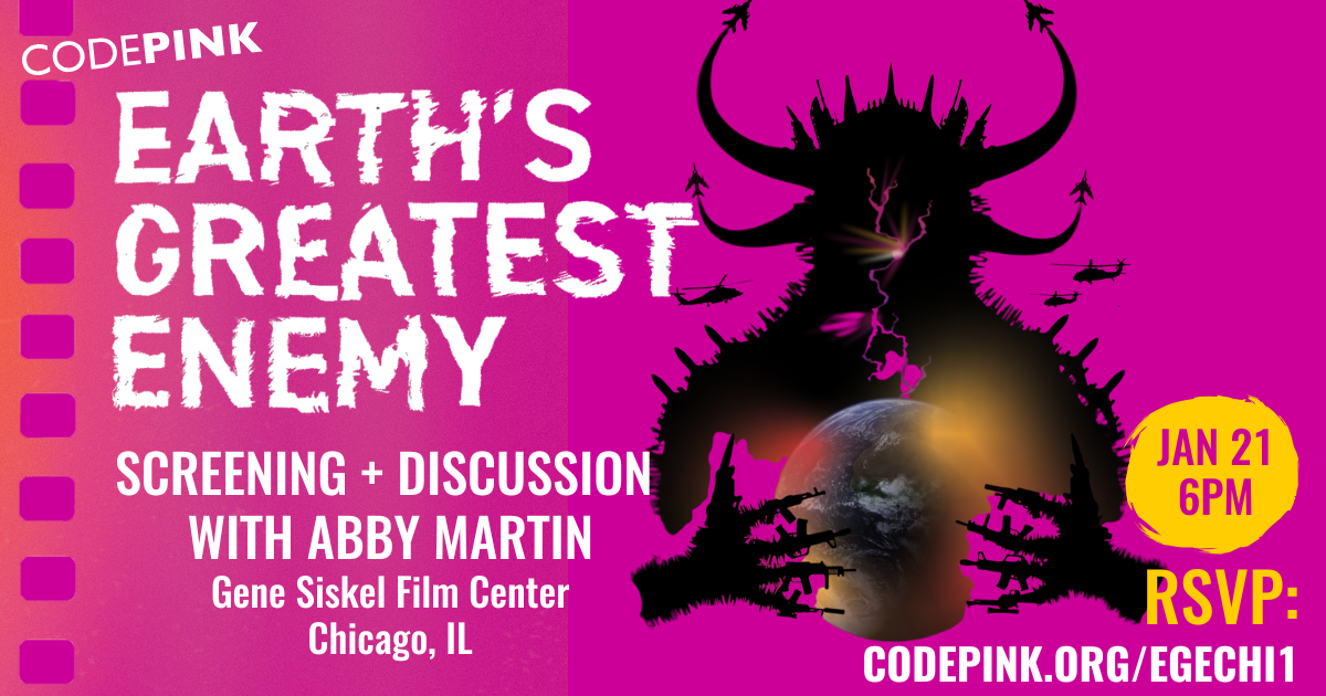 Join CODEPINK Chicago on January 21 at 6PM for a special screening of Earth's Greatest Enemy, featuring Q&A with Abby Martin and co-director Mike Prysner following the film.