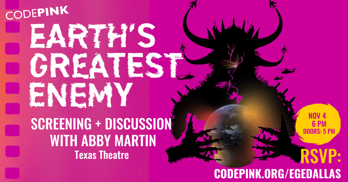 Join CODEPINK Dallas for a special screening of Earth's Greatest Enemy, featuring a Q&A with Abby Martin and co-director Mike Prysner following the film. Doors open at 5pm, and the screening starts at 6pm.