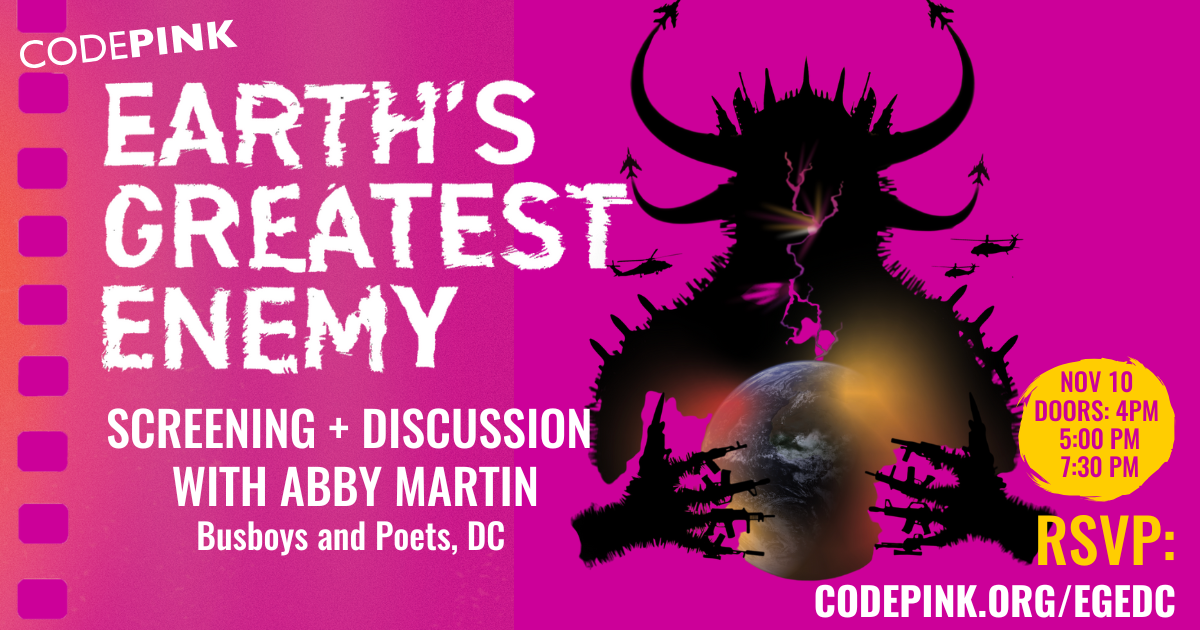 Join CODEPINK DC on for a special screening of Earth's Greatest Enemy, featuring Q&A with Abby Martin and co-director Mike Prysner following the film. Doors open at 4pm. The first screening and Q+A starts at 5 pm, and the second screening and Q+A starts at 7:30 pm.