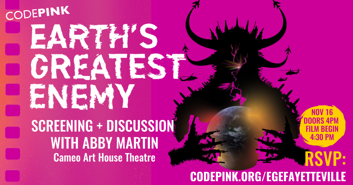 Join CODEPINK North Carolina for a special screening of Earth's Greatest Enemy, featuring a Q&A with Abby Martin following the film. Doors open at 4pm, and the screening starts at 4:30pm.