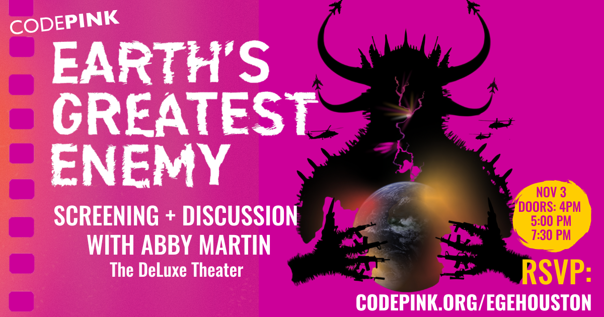 Join CODEPINK in Houston for a special screening of Earth's Greatest Enemy, featuring a Q&A with Abby Martin and co-director Mike Prysner following the film. Doors open at 4 pm, with the first screening and Q+A starting at 5 pm, and the second screening and Q+A starting at 7:30 pm .