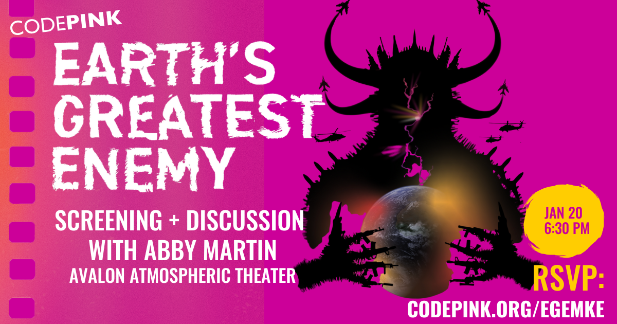 Join CODEPINK Milwaukee for a special screening of Earth's Greatest Enemy, featuring Q&A with Abby Martin and co-director Mike Prysner following the film. The screening and Q&A start at 6:30 pm.