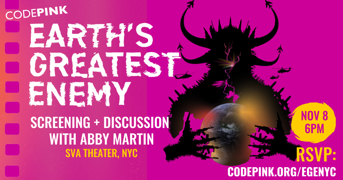 Join CODEPINK NYC November 8 at 6:00PM for a special screening of Earth's Greatest Enemy, featuring Q&A with Abby Martin and co-director Mike Prysner following the film.