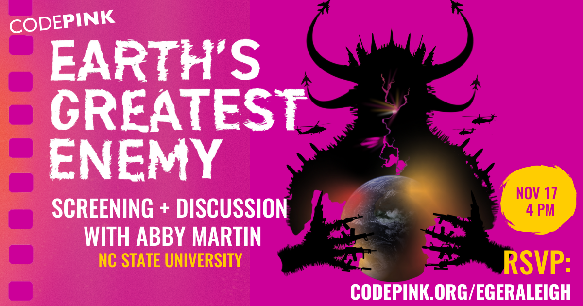 Join CODEPINK NC on November 17th at 4 PM for a special screening of Earth's Greatest Enemy, featuring virtual Q&A with Abby Martin following the film.