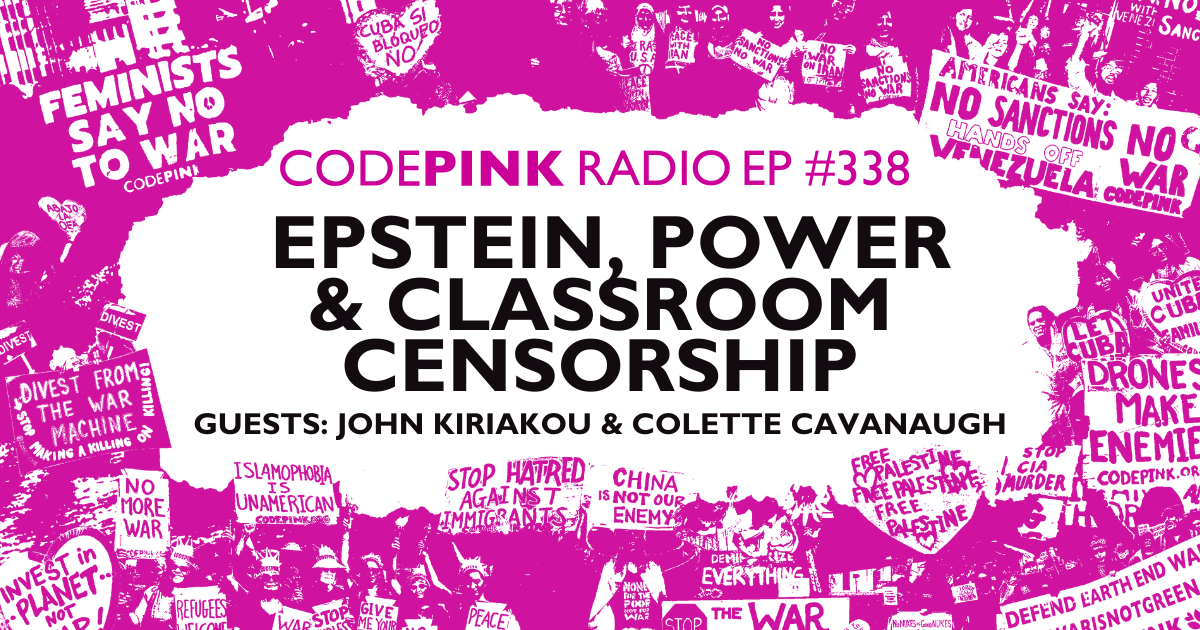 Episode 338: Epstein, Power & Classroom Censorship: This week on CODEPINK Radio, Marcy Winograd brings you a new episode featuring our first segment, Empire on the Rocks, with former CIA analyst John Kiriakou discussing the largely ignored story of Jeffrey Epstein and the geopolitical questions surrounding his network, followed by a conversation with Colette Cavanaugh of the American Arab Anti-Discrimination Committee on how educators and advocates are navigating the teaching of Palestine in U.S. public schools and defending the right to tell the truth about history and current events.