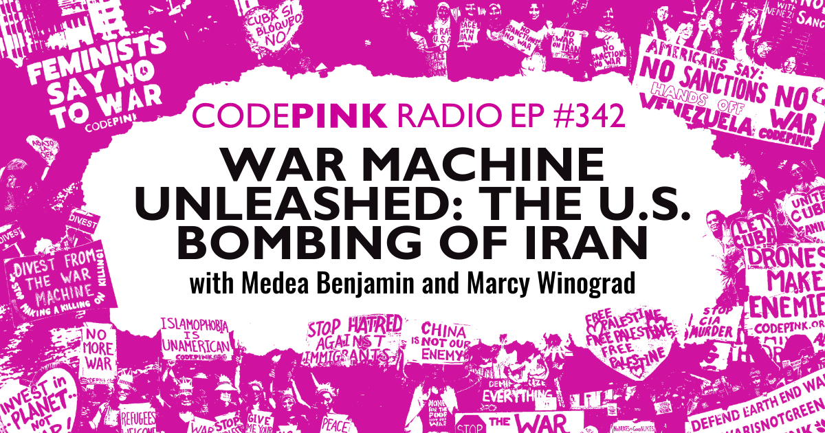 Episode 342: War Machine Unleashed: The U.S. Bombing of Iran: In this episode of CODEPINK Radio, cohosts Medea Benjamin and Marcy Winograd take on the US war machine as they deconstruct the madness that led to the US bombing of Iran. Our cohosts applaud global resistance to Trump and Netanyahu's unprovoked war on a country of 93-million people and share their thoughts on what lies ahead for the Gulf states hosting US military bases.