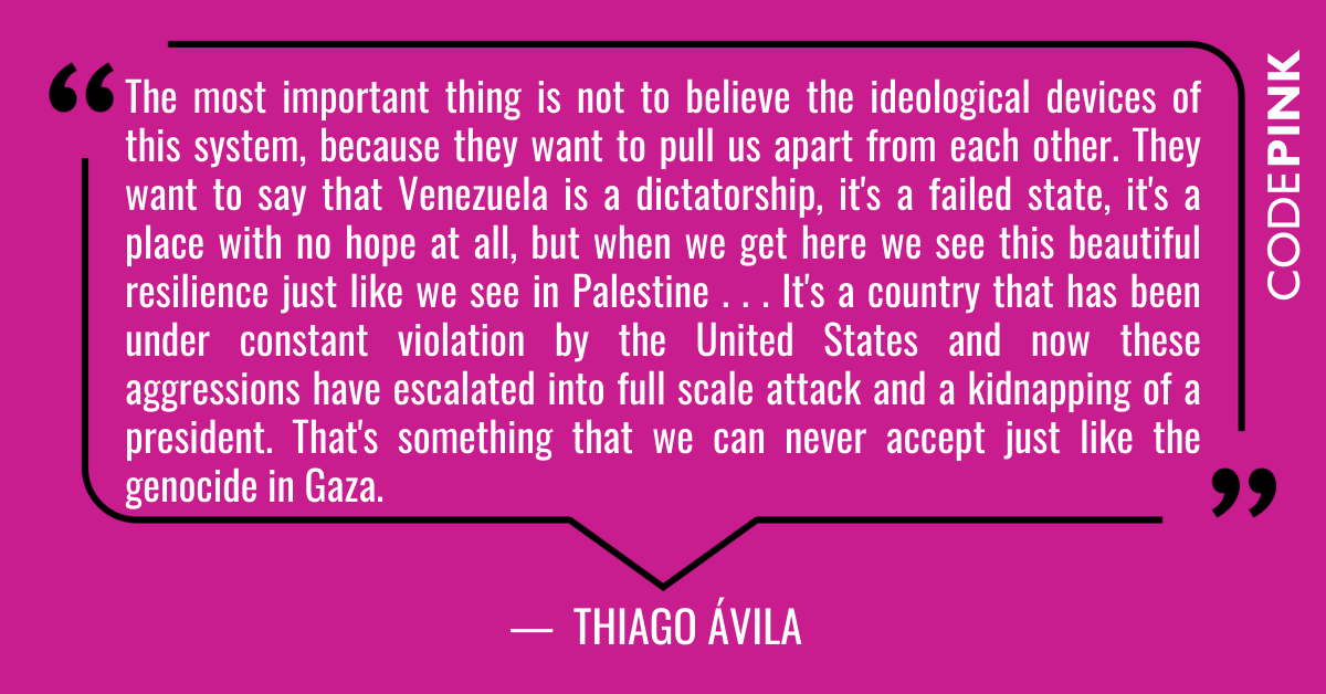 This week, CODEPINK was in Venezuela as part of an international peace delegation to witness the impacts of U.S. attacks and to learn how we can work towards peace.