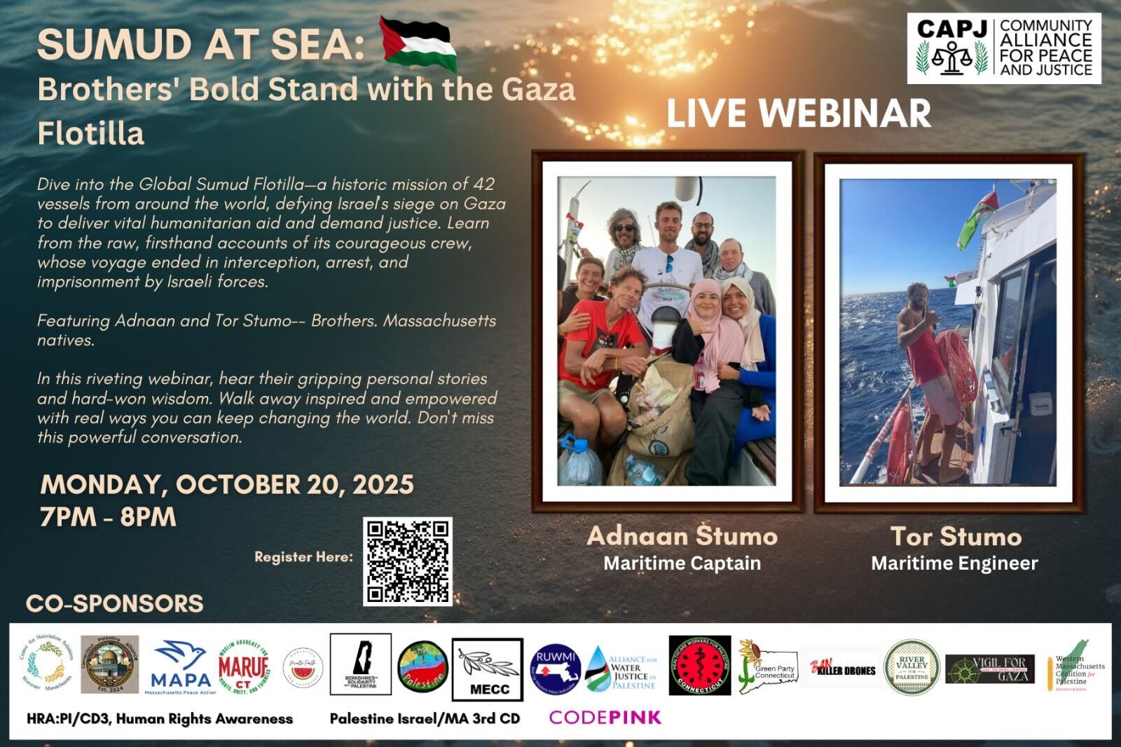 Join the Sumud at Sea webinar hosted by Community Alliance for Peace and Justice and co-sponsored by CODEPINK, where the brothers will talk about their experience on the Global Sumud Flotilla. They will recount their time on their boats and being in Israeli prison, all while connecting it to the broader Palestinian prisoner solidarity movement.