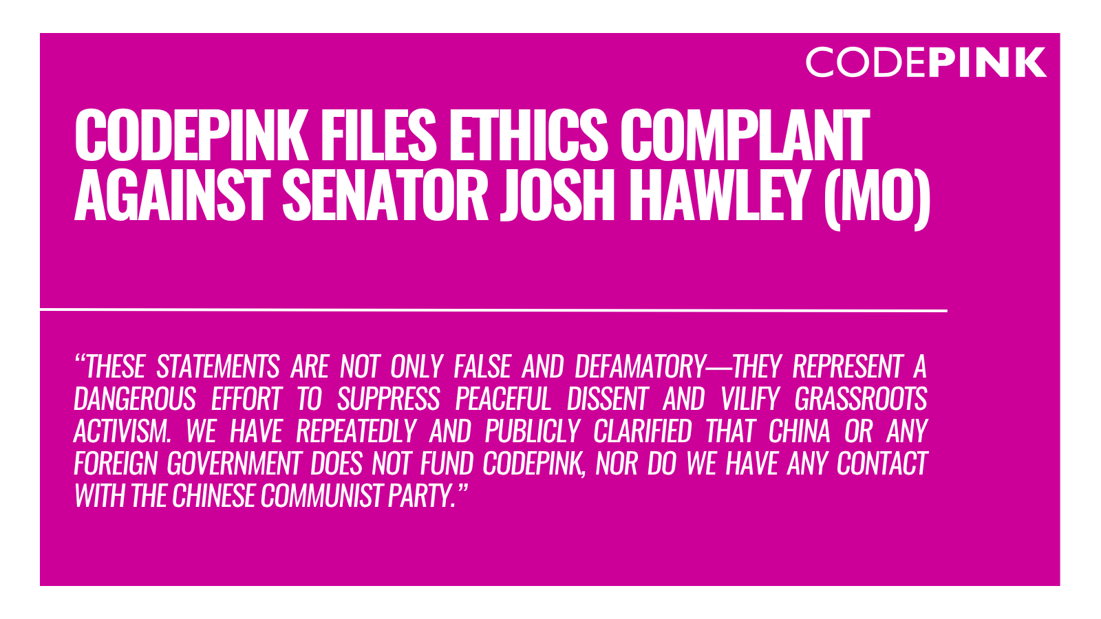 “These statements are not only false and defamatory—they represent a dangerous effort to suppress peaceful dissent and vilify grassroots activism,” said CODEPINK spokesperson. “We have repeatedly and publicly clarified that China or any foreign government does not fund CODEPINK, nor do we have any contact with the Chinese Communist Party.”