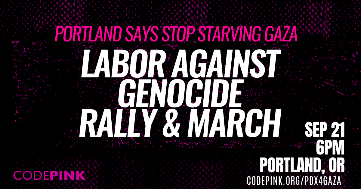 PORTLAND, Oregon – CODEPINK Portland will join a coalition of labor unions and community organizations for a "Labor Against Genocide" rally and march on Sunday, September 21st. The event is organized in solidarity with Palestinian trade unions to pressure elected officials to end US complicity in Israel’s genocide of Palestinians and to mourn the profound suffering and loss of life in Gaza.