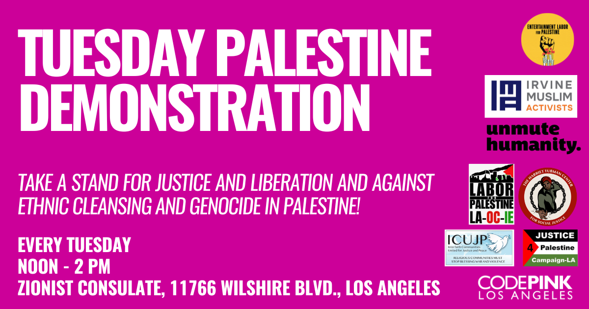 Join CODEPINK LA, Interfaith Communities United for Justice and Peace, Entertainment Labor for Palestine, Unmute Humanity, the Harriet Tubman Center for Social Justice, Labor for Palestine LA-OC-IE, Irvine Muslim Activists, Justice4Palestine-LA, and community members for a demonstration for Palestine every Tuesday from noon-2pm outside of the zionist consulate!