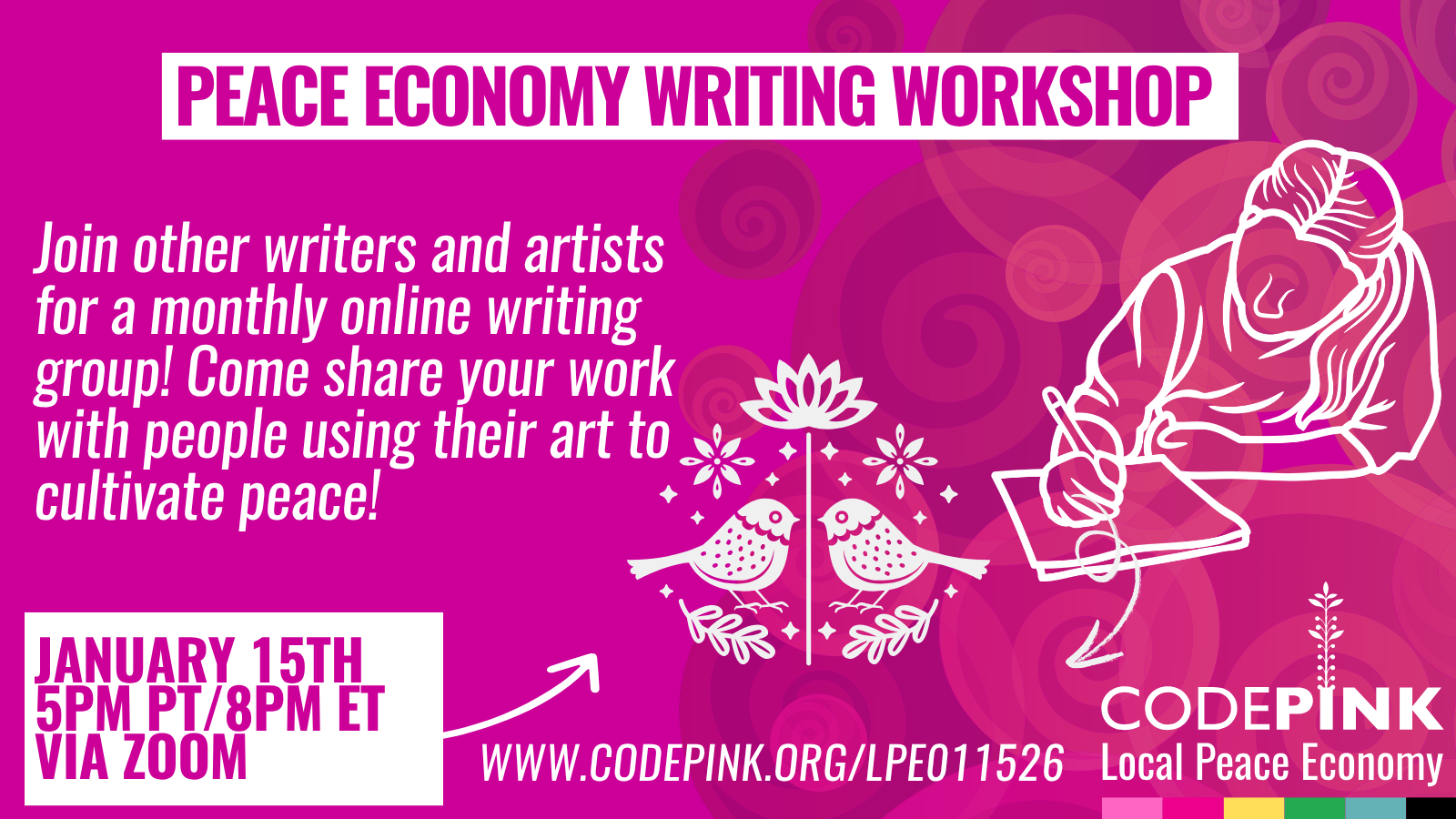 Let's get together to workshop our writing in a supportive environment: poems, short stories, songs and novel chapters (up to 1,000 words). The workshop will focus on the peace economy: works that speak to a culture of empathy, solidarity and connectedness, and resist a culture of violence and war. Please feel free to bring work to share via a Google Doc link. All skill levels are welcome -- We hope to see you there!
