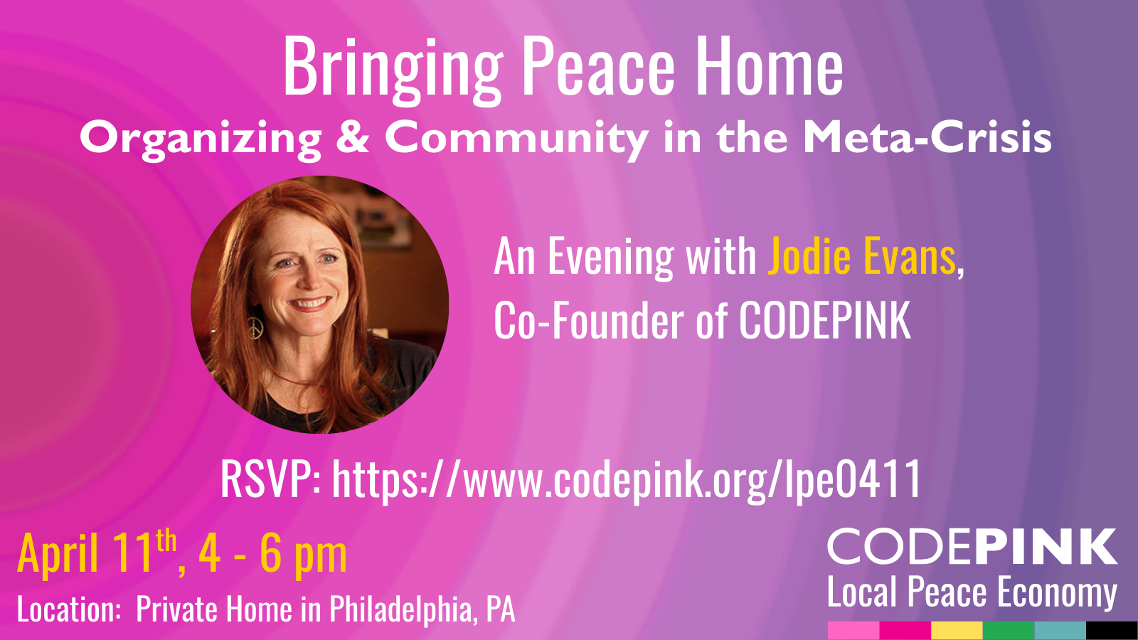 Join CODEPINK's Jodie Evans and the awesome organizers of CODEPINK Philadelphia for an intimate gathering focused on cultivating our Local Peace Economy and engaging together.