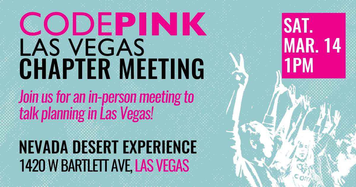 Join us for an in-person CODEPINK Las Vegas chapter meeting at the Nevada Desert Experience HQ house! We will share out flyers that we can distribute at events and in the community; go over how to make CODEPINK posters and give out poster boards and pink and black markers; and introduce the CODEPINK community closet. Community members can give and take clothes, props, and signs to represent CODEPINK. We will also discuss the new regional organizing model and help each other as needed.