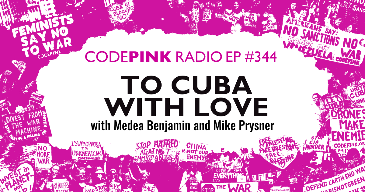 Episode 344: To Cuba with Love: CODEPINK Co-founder Medea Benjamin returns from a humanitarian aid delegation to Cuba to debrief the delegation’s work delivering medicines and supplies. On the second half of CODEPINK Radio, Mike Prysner, the new exec director of the Center for Conscience and War talks to us about conscientious objectors in the military resisting Trump’s unprovoked war of aggression against Iran.