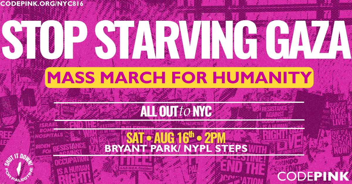 NEW YORK, NY — On Saturday, August 16, 2025, CODEPINK will join a Mass March for Humanity in New York City alongside peace organizations and activists from all over to demand an immediate end to the U.S.-funded, Israeli-enforced famine in Gaza. The march will begin at 1:00 PM at Bryant Park/New York Public Library Steps and continue through the streets of Manhattan.