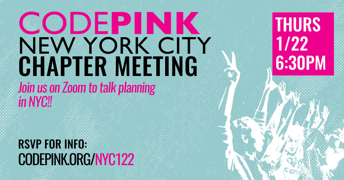 Join CODEPINK NYC for a chapter meeting to plan upcoming events, build anti-imperialist feminist community, and chat about resisting the war economy in NYC!Â