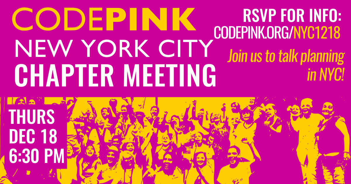 Join CODEPINK NYC for a chapter meeting to plan upcoming events, build anti-imperialist feminist community, and chat about resisting the war economy in NYC!Β