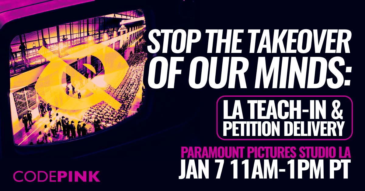 LOS ANGELES, CA — A coalition of activist groups, including CODEPINK LA, Entertainment Labor for Palestine, and Indivisible, will hold a public teach-in and petition delivery outside Paramount Studios on Wednesday, January 7th, at 11:00 AM. The action aims to expose the dangerous media takeover following the recent acquisition of Paramount and CBS by David Ellison, and to protest the airing of Israeli propaganda ads on Paramount platforms.