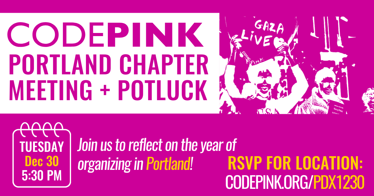 Join CODEPINK Portland for our last chapter meeting of the year! We'll reflect on the past year of organizing for peace and share small bites and drinks.Β