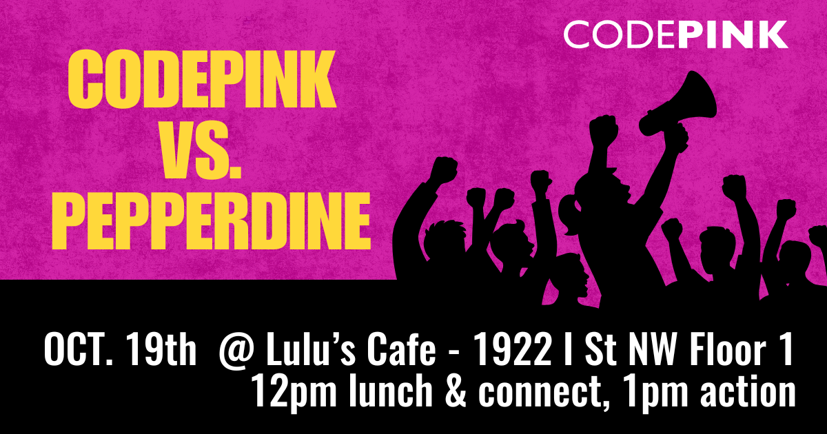 WASHINGTON –CODEPINK and allied organizations plan to protest Pepperdine’s appointment of Rev. Johnnie Moore as Vice Chancellor. The action is scheduled for Friday at 1 p.m. ET outside Pepperdine University's Washington, D.C., campus.