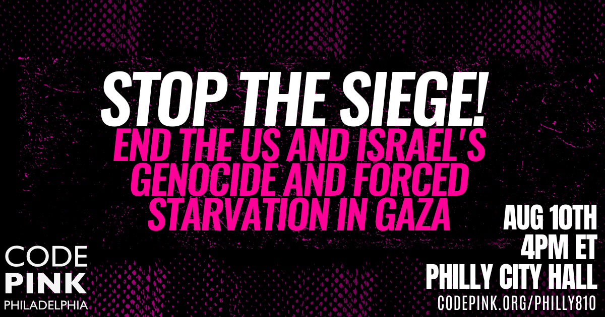 PHILADELPHIA, PA — This Sunday, August 10th, CODEPINK Greater Philly will join the Philly Palestine Coalition and over 20 organizations for a city-wide protest against the ongoing genocide and forced starvation in Gaza. The “Stop the Siege” rally will take place outside Philadelphia City Hall at 4:00 PM, demanding an immediate end to the U.S. and Israeli genocide that has killed hundreds of thousands of Palestinians and pushed Gaza into famine.