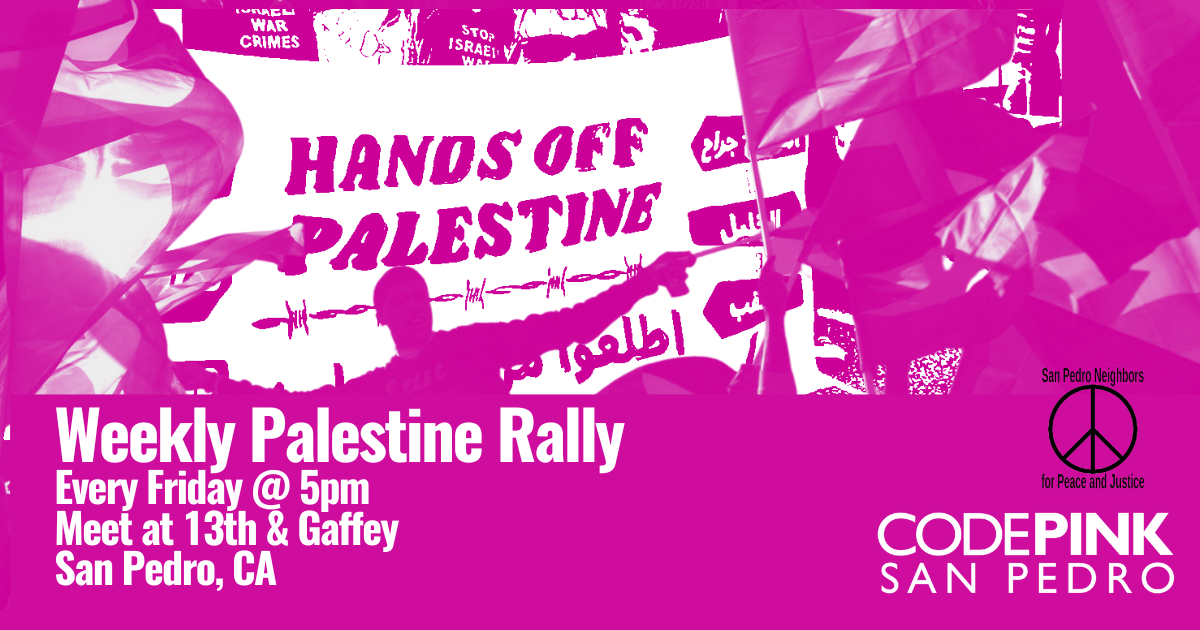 Join CODEPINK San Pedro at 5pm promptly at the corner of 13th and Gaffey St., in front of Vons. This is the site of our weekly rally to Free Palestine from war where we leaflet and gather in community.