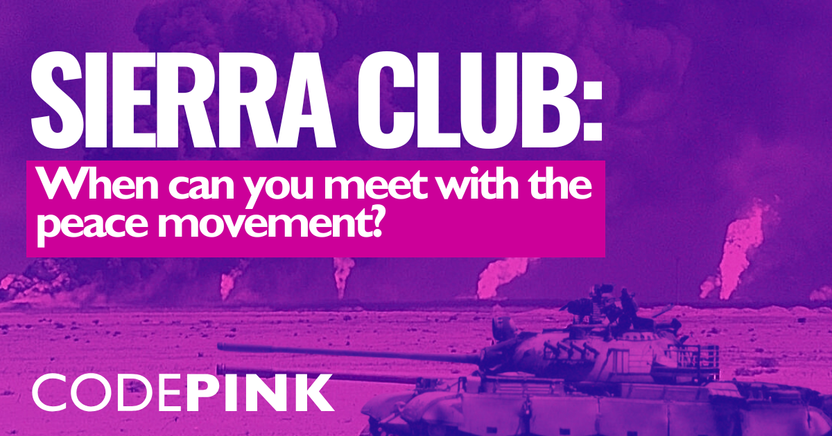 We, the undersigned, are asking you to meet with representatives from CODEPINK’s War is Not Green (WING) campaign to discuss what it would mean for the Sierra Club to champion an anti-war stance in defense of the planet. You’ve dedicated your life to saving the planet, and we admire you deeply for it.
