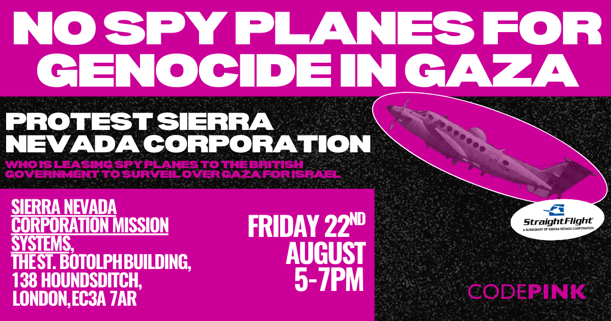 LONDON, UK — On Friday, August 22, 2025, from 5:00 PM to 7:00 PM (BST), CODEPINK London will hold a "No Spy Planes for Genocide" rally outside the UK headquarters of Sierra Nevada Corporation Mission Systems at The St Botolph Building, 138 Houndsditch, London EC3A 7AR. As CODEPINK London protests at SNC’s UK headquarters, CODEPINK Reno will simultaneously demonstrate at Straight Flight Leasing and SNC’s HQ in Sparks, Nevada, demanding an immediate end to the UK and US’s role in enabling Israel’s atrocities.