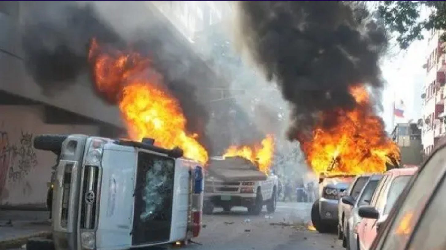 Machado was a key figure in organizing guarimbas, violent riots aimed at causing chaos and paralyzing the country in order to provoke political and economic collapse. In 2014, Machado was a key organizer and supporter of guarimbas that killed her political opponents, burnt down public infrastructure, and set ambulances and doctors on fire. Again in 2017, she helped to organize and fund the guarimbas which killed 200 people and wounded more than 15,000, and caused significant damage to bus drivers, metro workers and passengers, hospitals, roads, and other public buildings. These riots targeted people living their daily lives: barricades were erected to stop people going to work or school, bus drivers were attacked for transporting people, metal wires were hung to kill anyone who tried to bypass them, and the public infrastructure for life was destroyed. This onslaught on Venezuelans strived to make their lives unbearable to inflict the maximum social damage to force political change through terror and violence. After the presidential election in 2024, Machado’s party funded saboteurs to stage tire-burning protests and attack military bases in an attempt to spur more guarimbas and justify the US and opposition’s call that the election was a “fraud”.