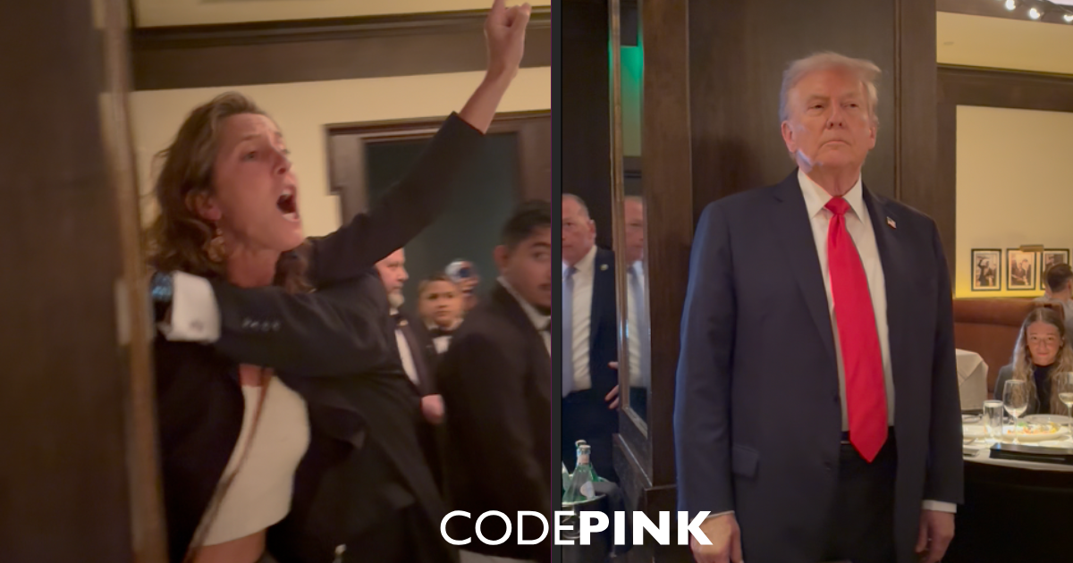 “While Trump, JD Vance, Marco Rubio, Pete Hegseth, and others feasted at a steakhouse, we stood our ground and told them the truth,” explained CODEPINK’s DC organizer Olivia DiNucci. “Two years into genocide, Gaza is under evacuation orders, Puerto Rico and Venezuela are in the crosshairs, and the Pentagon proudly calls itself the Department of War. Trump looked us in the eyes, and we made sure he would never dine in peace while communities are under siege,” she continued.