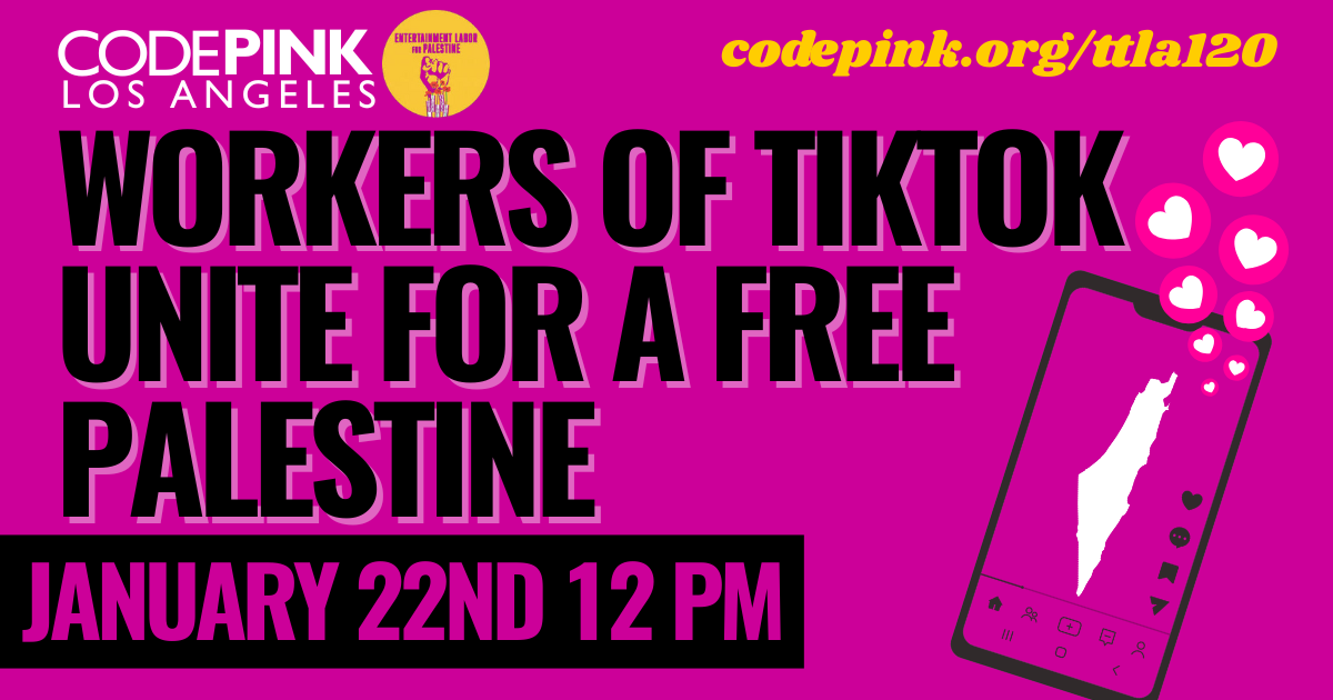 Join CODEPINK LA and Entertainment Labor 4 Palestine, calling on the workers of TikTok to unite to keep Palestine Alive in the censorship practices of the Ellisons. We have seen it play out at CBS News, which is now the Trump Propaganda Network. Or as Nikki Glazer said, "See BS News."
