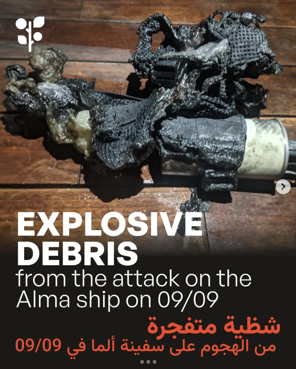 [Attack on Global Sumud Flotilla's "Alma". Source.]