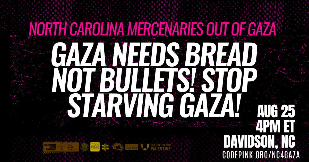 - WHAT: “Bread Not Bullets” Rally to expose Davidson-based UG Solutions for contracting U.S. mercenaries to operate at militarized Gaza Humanitarian Foundation (GHF) “aid sites,” where Palestinians face starvation and violence.