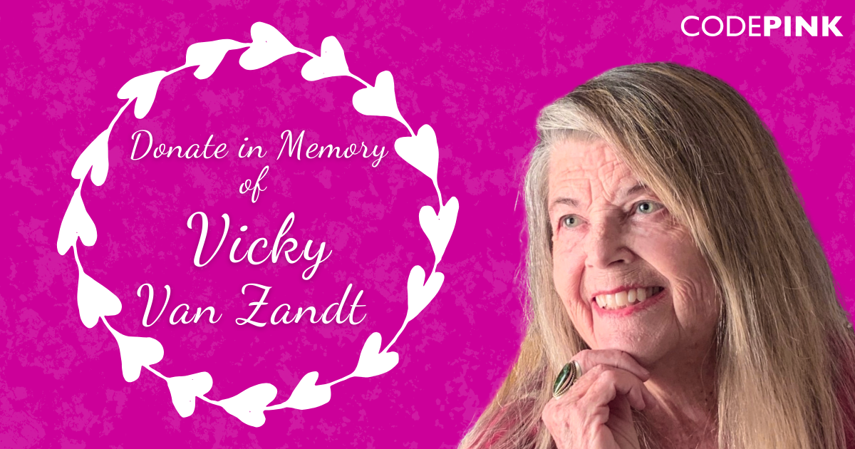 On Wednesday, August 13, 2025, we lost our beloved friend, sister, and community pillar, Victoria “Vicky” Van Zandt, suddenly and without warning. Vicky’s life was a testament to love, joy, and unwavering dedication to peace. Vicky found a true home and purpose in fighting for justice alongside CODEPINK. Donating in her memory helps continue her work for peace and solidarity with Palestine and ensures her legacy lives on in action.