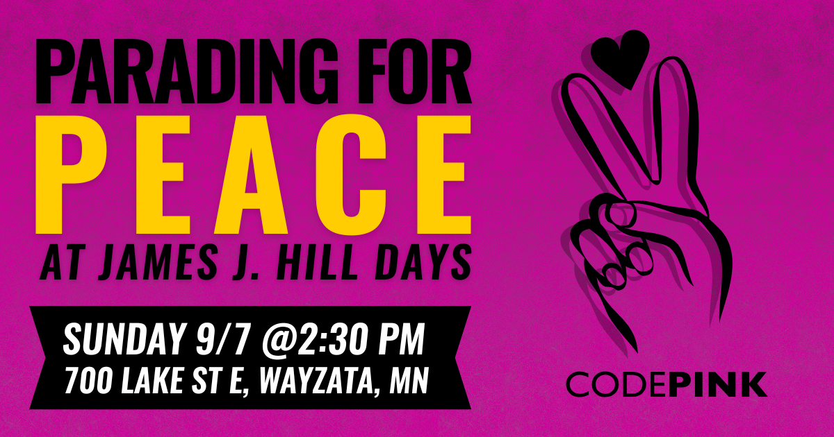 Calling all peace-minded people in and around the Twin Cities! Join CODEPINK on Sunday, September 7th to march in the James J. Hill Days Parade in Wayzata!