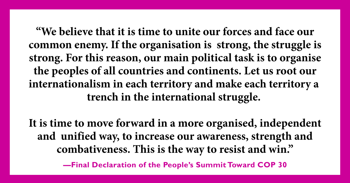 ICN could also be looking at writing on the visions for the future proposed at this year’s COP by social movements: This COP, in the face of brutalization from the militarized security presence at COP, the movement was clear-eyed: with adamant demands to demilitarize, remove Israel from the UNCCC for its complicity in genocide and ecocide, to include military emissions in emissions tracking, and to undo the colonialism and extraction from Indigenous territory that the war economy has made possible. The People’s Summit Toward COP 30 brought many of these demands together in a counter-summit of Brazilian and allied international social movements. The final declaration of the People’s Summit — unreported on by most outlets, including ICN — makes 15 clear demands, including demilitarization. It concludes with this: